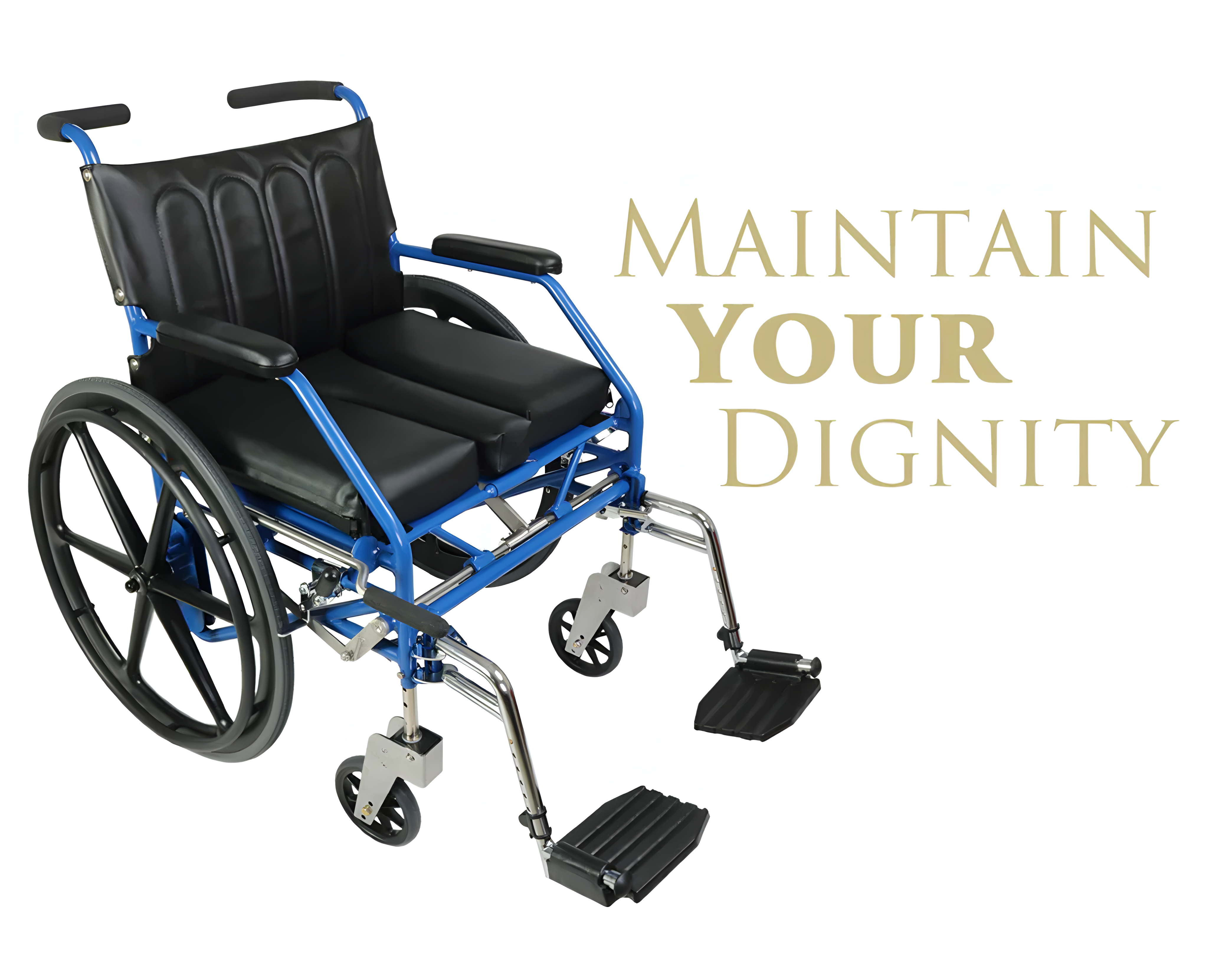 The DignityTM AllDay 400 Wheelchair was designed as a manual fixed-frame wheelchair for all-day use with an amazing feature — it has a lever-controlled drop-seat system that allows the user to back over and use a toilet without ever needing to do a transfer.